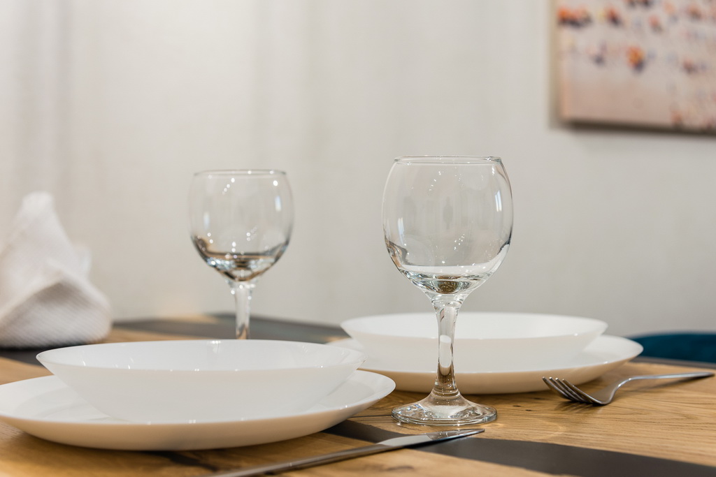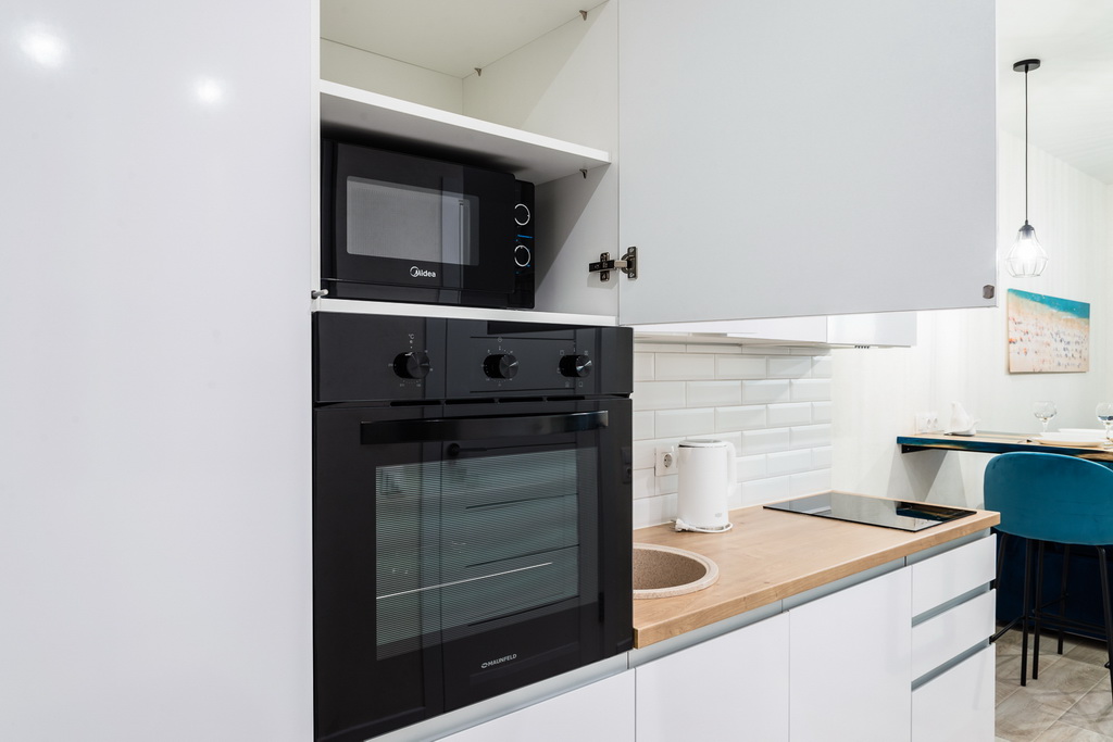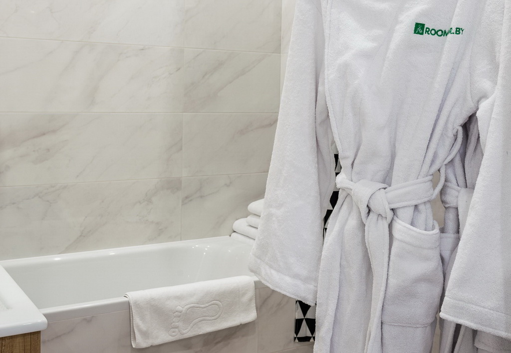 Апартаменты соответствуют гостиничным стандартам: белоснежное постельное белье из сатина в полоску, махровые халаты и тапочки, премиальная косметика Rumah, зубные щетки с пастой, бритвенный и швейный набор.