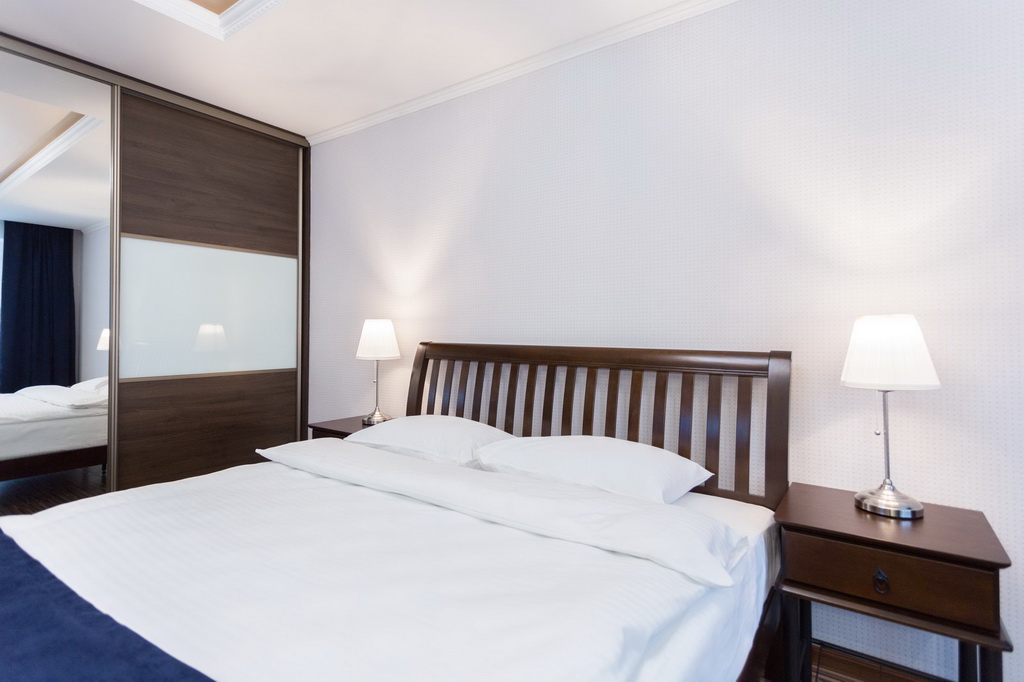 Апартаменты соответствуют гостиничным стандартам: белоснежное постельное белье из сатина в полоску, махровые халаты и тапочки, премиальная косметика Rumah, зубные щетки с пастой, бритвенный и швейный набор.