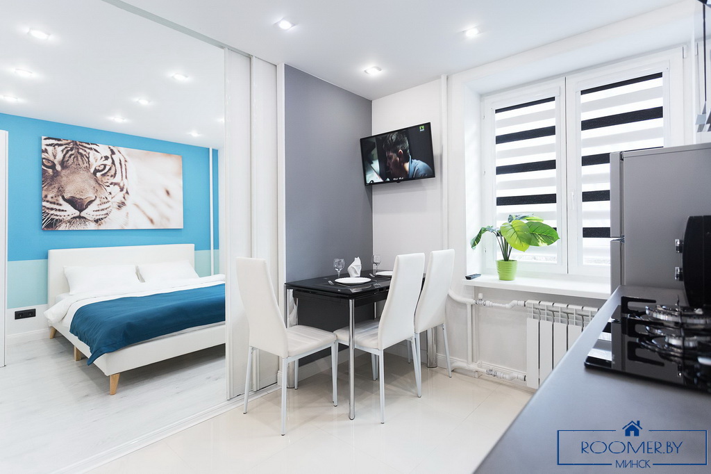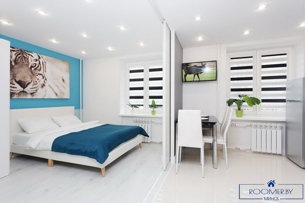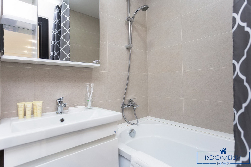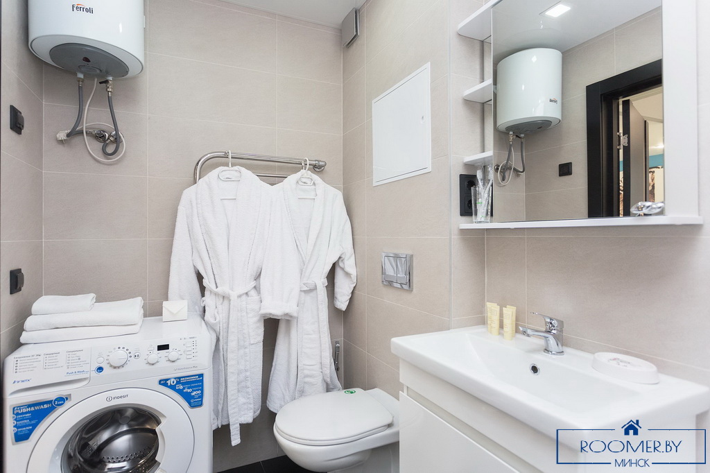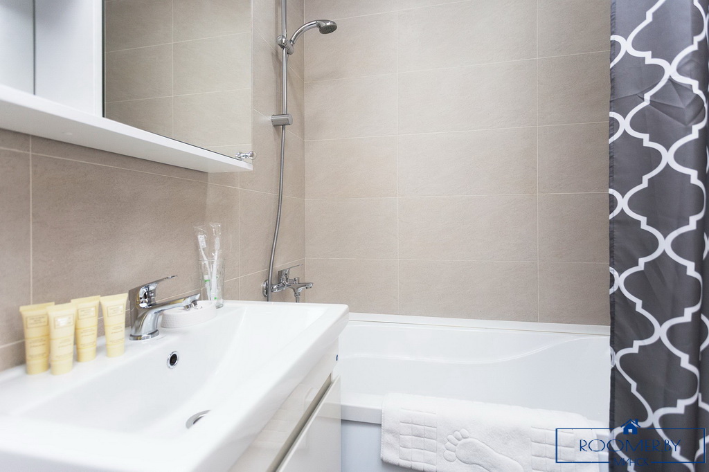 Апартаменты соответствуют гостиничным стандартам: белоснежное постельное белье из сатина в полоску, махровые халаты и тапочки, премиальная косметика Rumah, зубные щетки с пастой, бритвенный и швейный набор.