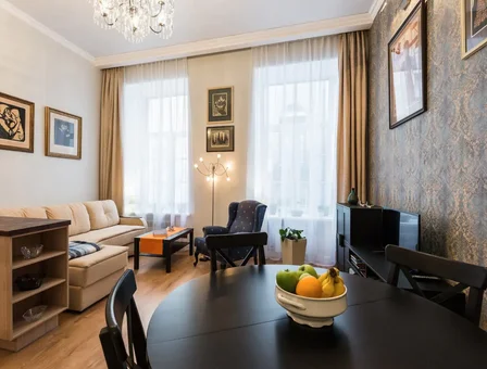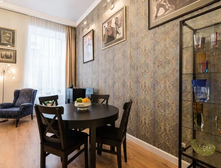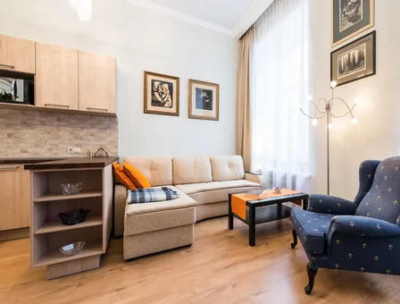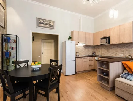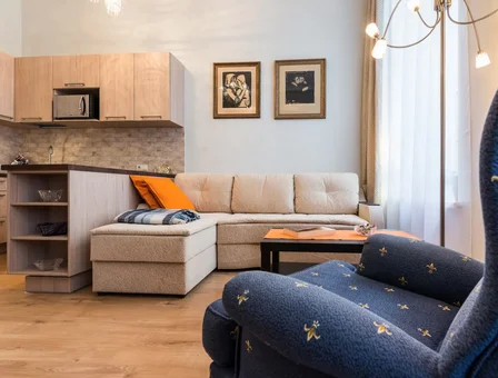 One-bedroom studio apartment in Minsk with a double bed, a spacious sofa bed and a kitchen that can accommodate up to 4 people. Geographically, the apartment is located next to the Central Department Store and the Yakub Kolas metro station.